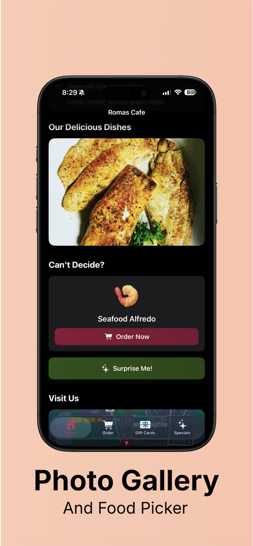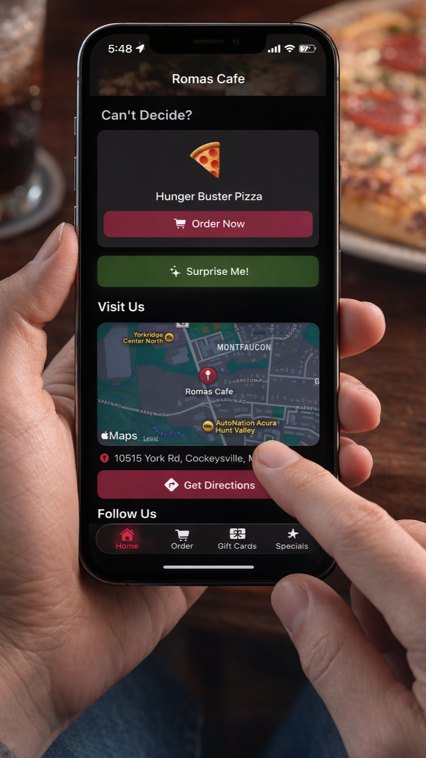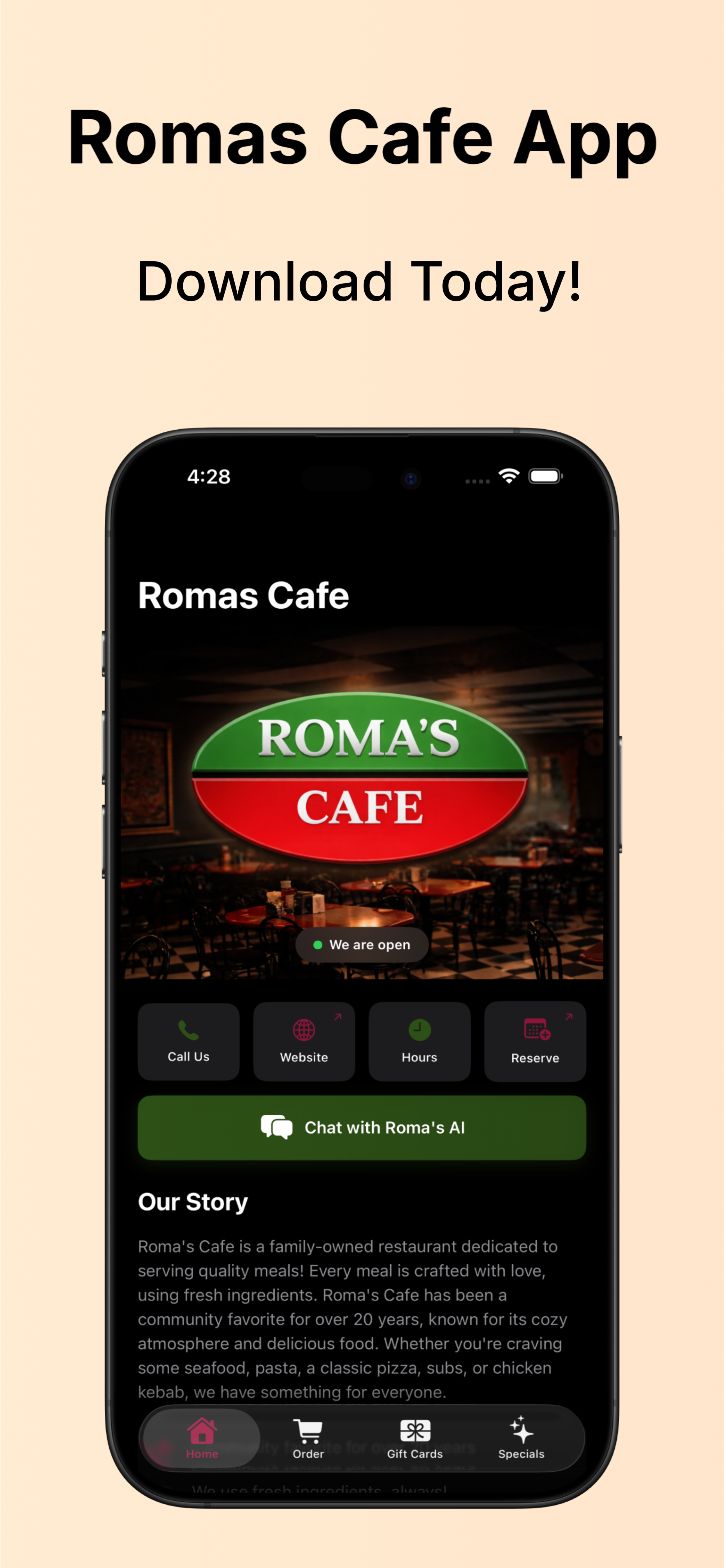 Roma’s Cafe is a full-stack restaurant and customer engagement app I designed and developed to modernize my family’s restaurant through a unified digital platform. Built as an all-in-one customer experience solution, the app streamlines restaurant discovery, menu browsing, online ordering, reservations, gift card purchases, daily specials, and customer interaction through a polished mobile-first interface.