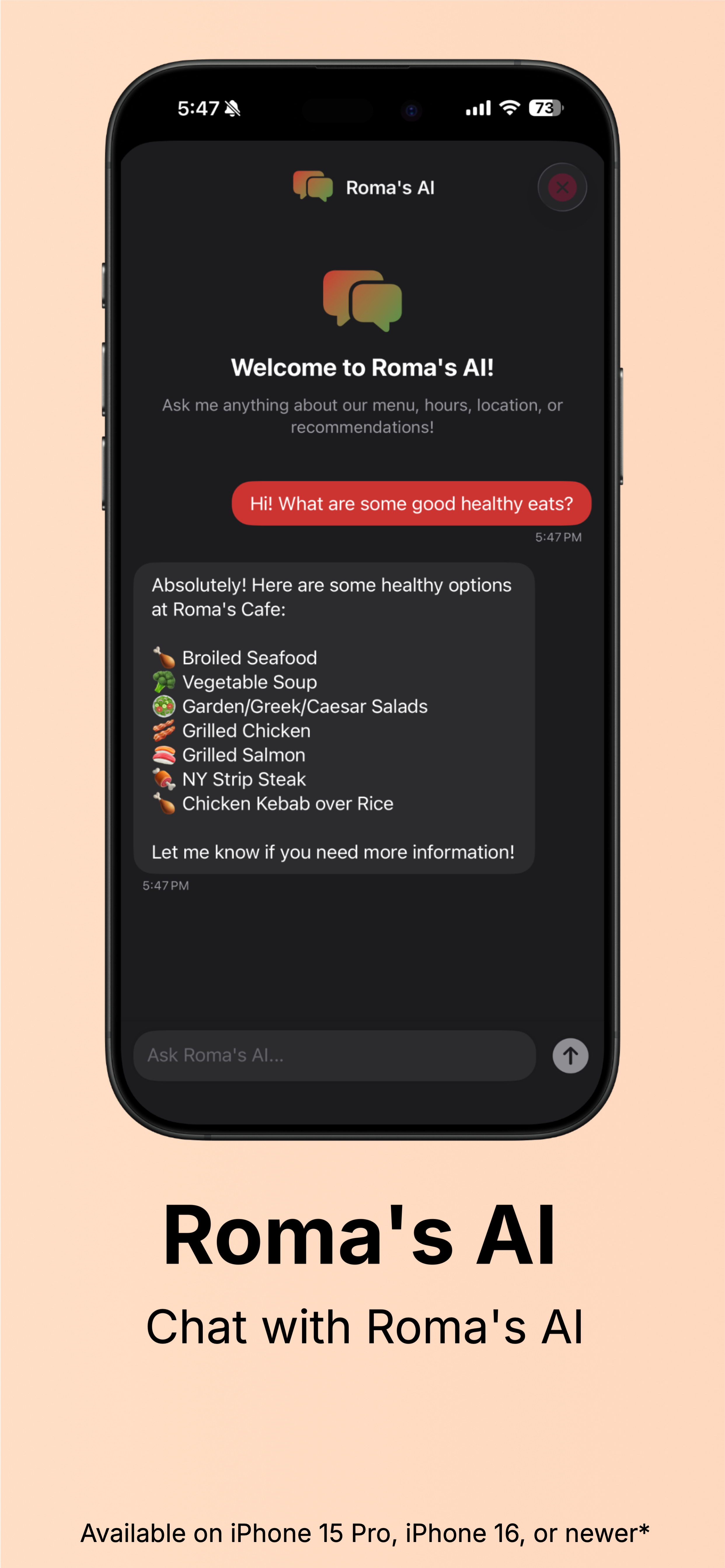 The platform integrates real-time open/closed status, Toast-powered digital ordering, AI-powered customer assistance, dynamic specials, Apple Maps navigation, and automated operational updates to improve both customer convenience and business efficiency. Designed with a focus on user experience, accessibility, and operational automation, Roma’s Cafe transforms a traditional family-owned restaurant into a modern digital brand while preserving its identity and community presence.
